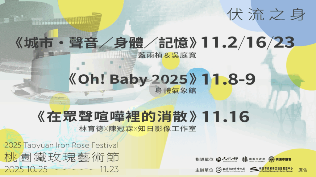 半透明城市,是由今年鐵玫瑰藝術節拋出的想望,回應透明社會帶來的疲憊。我們視劇場為一處不斷探索人與社會之間關係、預演現實的空間,半透明的意思是,我們更在意如何透過各個創作的邊界之眼,以及共享當下經驗的觀眾之心,晃動城市中可見與不可見的既定關係。 2025 桃園鐵玫瑰藝術節 團隊影片 伏流之身 2025-10-18 2025 桃園鐵玫瑰藝術節 團隊影片 亞際之窗 2025-09-27 2025 鐵玫瑰藝術節 前導宣傳影片 2025-08-16 結城座的懸絲奇蹟 ─ 偶戲《變形記》首度登台 2025-08-15 2025桃園鐵玫瑰藝術節8/15啟售! 2025-08-13